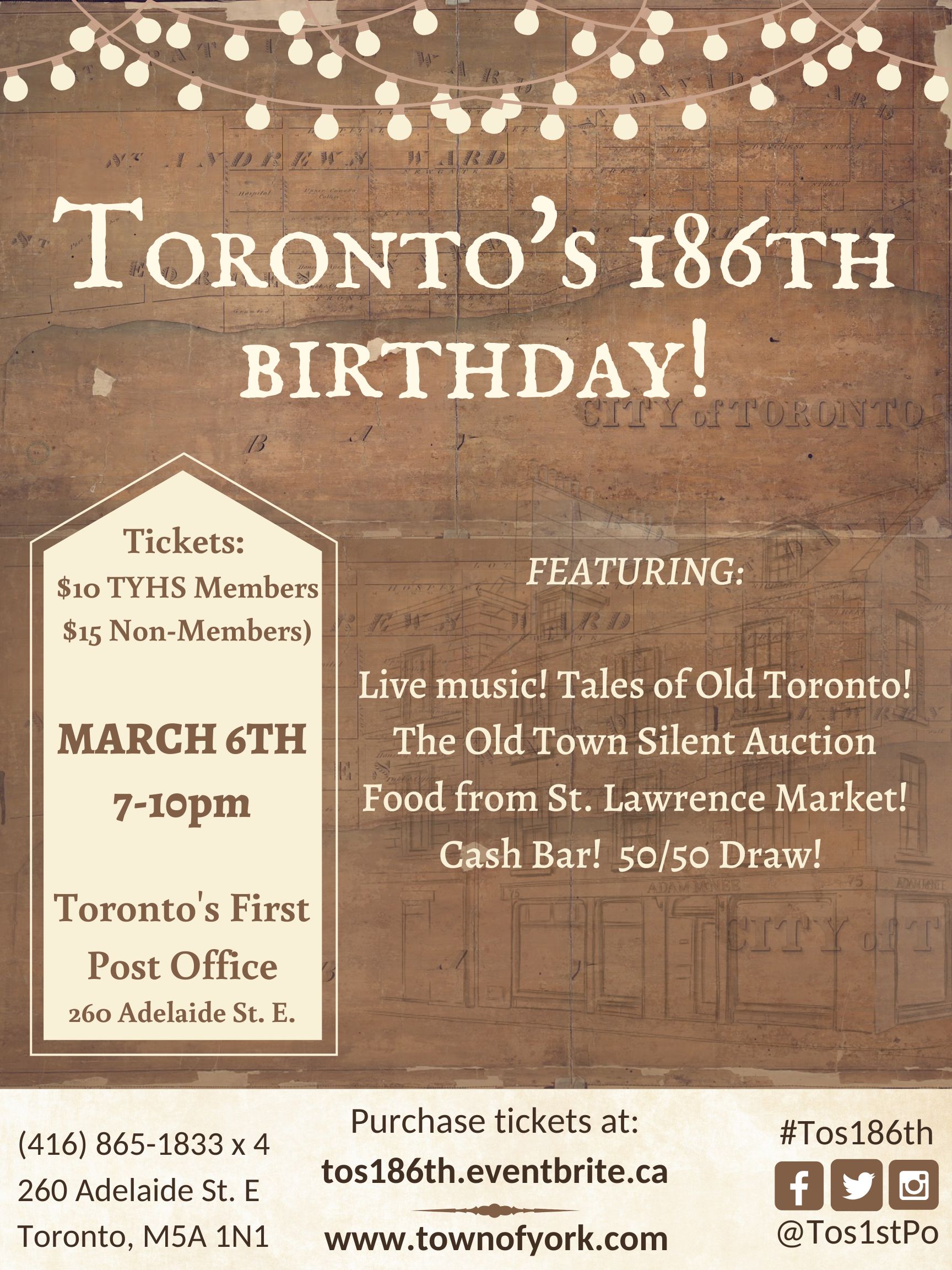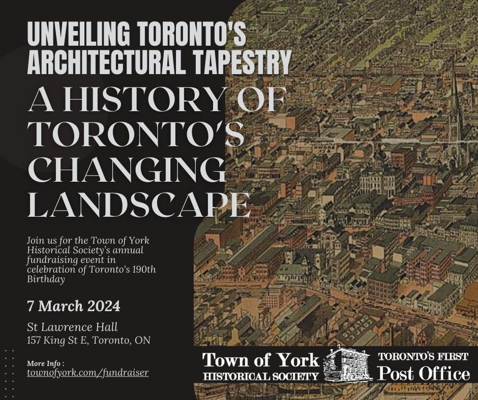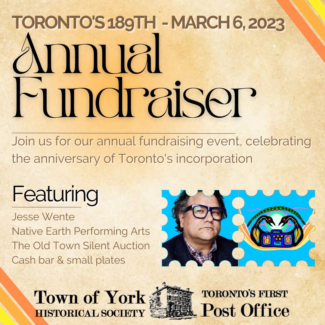 Purchase your TicketsJoin us for a captivating evening of celebration at Toronto's First Post Office & the Town of York Historical Society's annual fundraiser in celebration of Toronto's 192nd Birthday. This event not only commemorates the incorporation of the City of Toronto from the Town of York on March 6, 1834, but also serves as a significant opportunity to support the preservation of our rich cultural heritage.